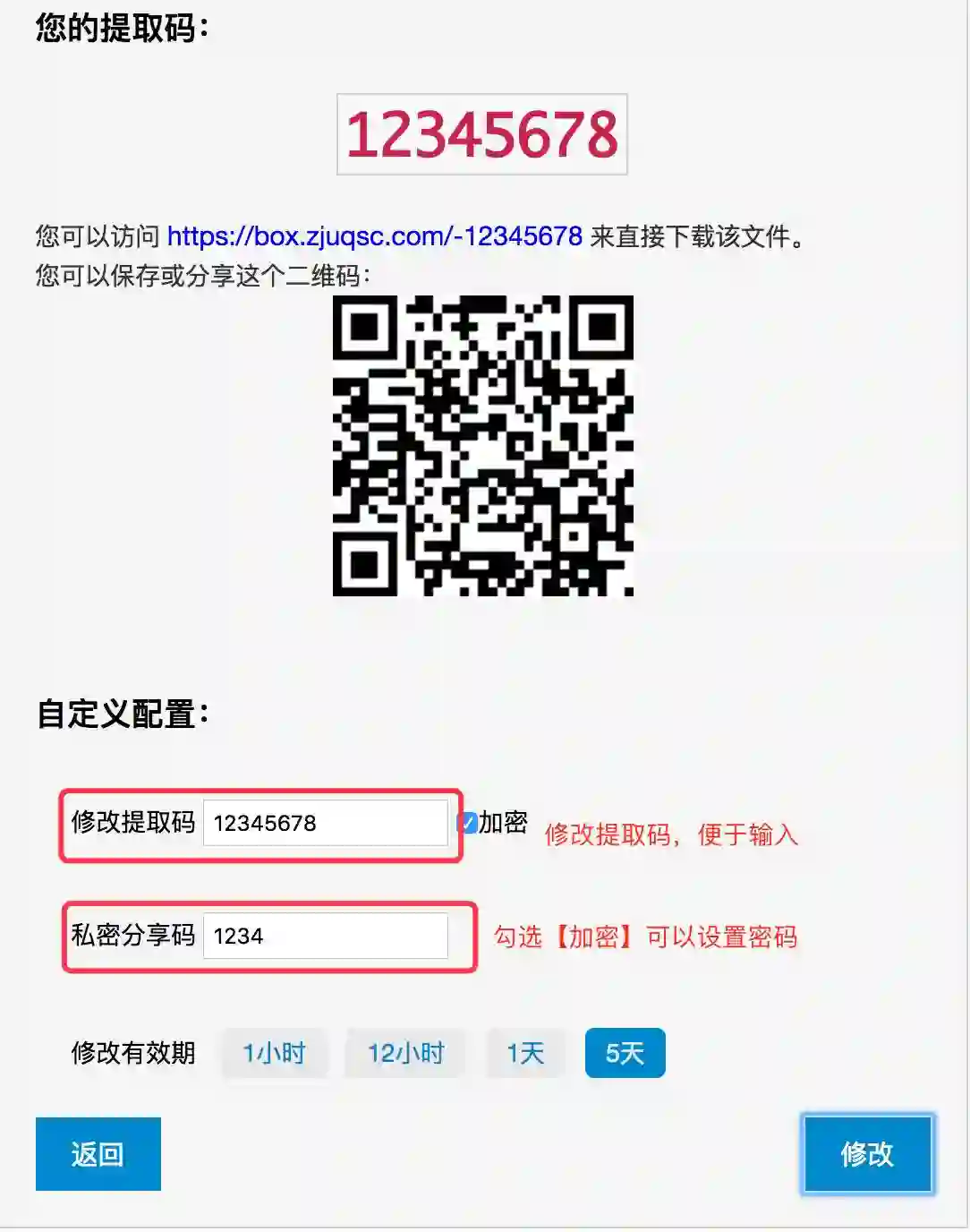 上传成功,显示提取码,可以进行简单的权限设置,修改提取码,便于下一步在 Kindle 中输入下载,设置私密分享密码,适用于私密文档,防止被肆意传播;
