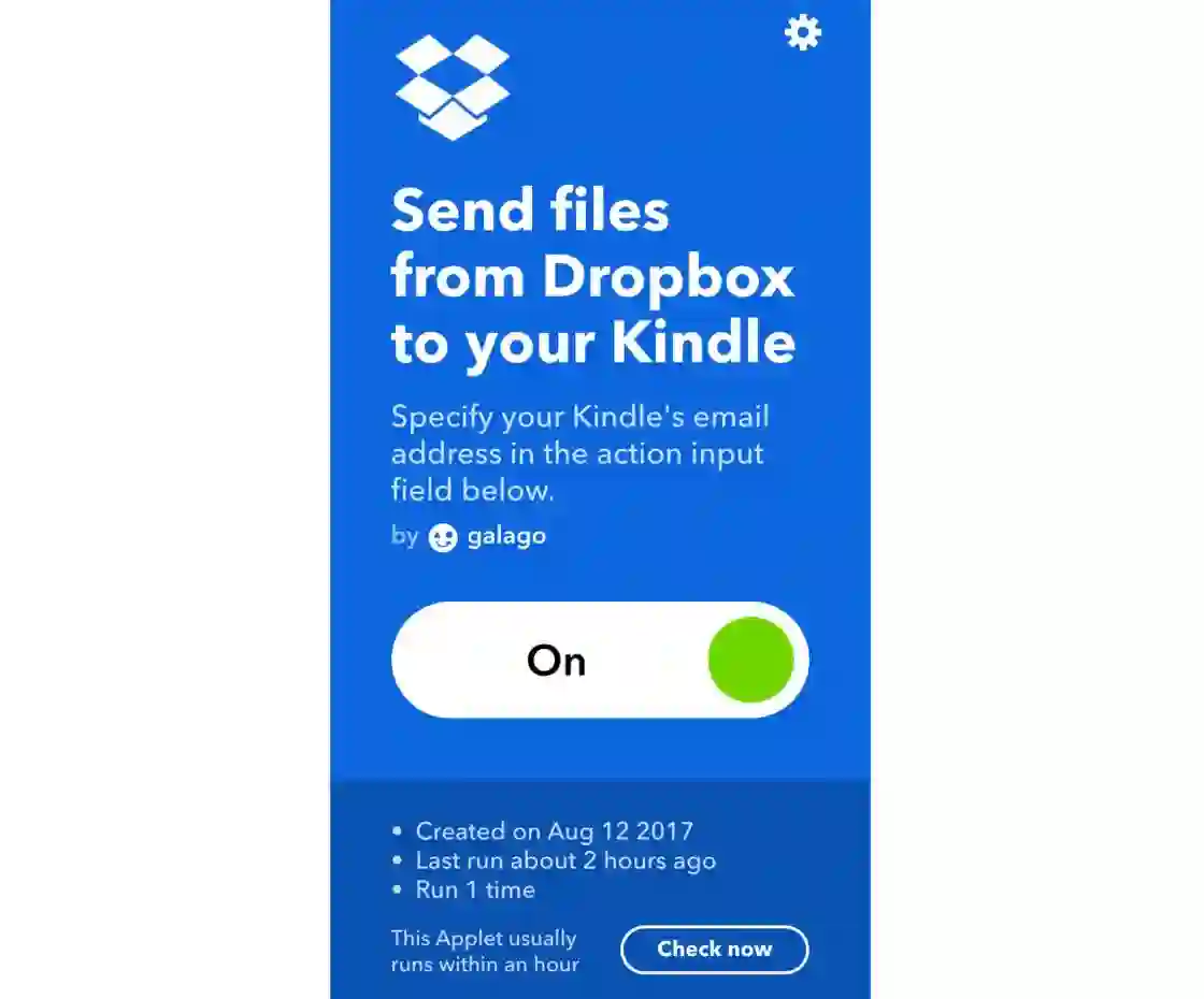 如果我们的文档文件比较多,每次推送都需要打开邮箱去通过附件推送。那这个发送邮件的过程能否做到自动化呢?答案是肯定的。利用 Dropbox 和 IFTTT,通过 Gmail 就可以做到自动将 Dropbox 指定文件夹下的文件发送到 Kindle 设备邮箱。