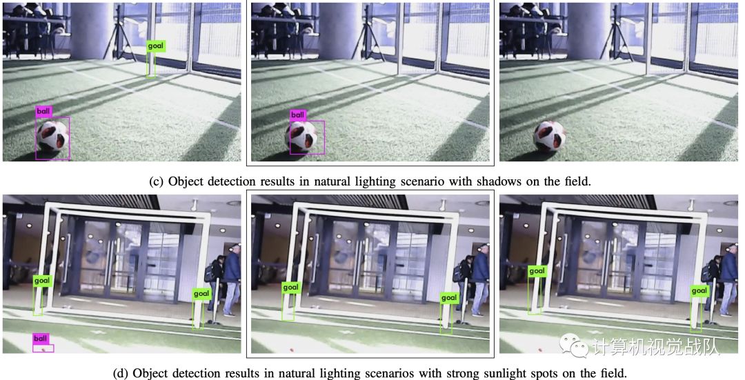 示例目标检测结果由模型产生。左侧:Tiny-YOLO,中间:xYOLO,右侧:Tiny-YOLO-XNOR。当每个网络识别达到检测阈值的对象时,球和球门被标记。可以观察到,xYOLO的目标检测结果优于Tiny-YOLO-XNOR,其结果与Tiny-YOLO具有可比性。