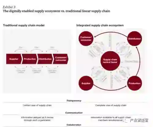 今天的供应链是通过市场营销,产品开发,制造和分销,并最终落到客户手中的一系列基本上离散的,孤立的步骤。数字化打通这些了这些墙壁,形成一根链条,变成一个完全集成的生态系统,对所有参与者,从原材料,零部件供应商,到这些供应品和成品的运输商,以及最终的客户都得到满足。