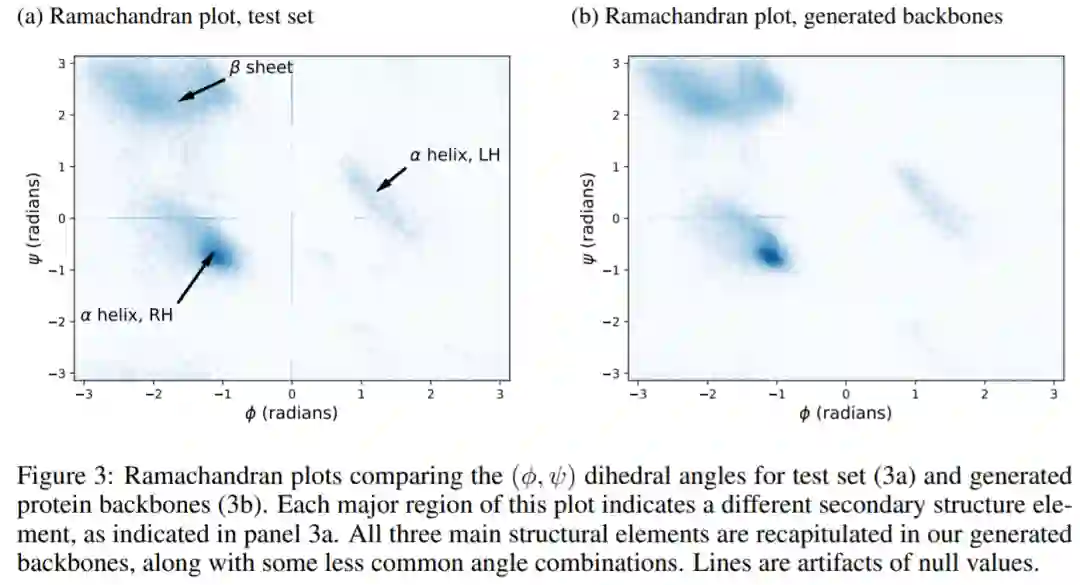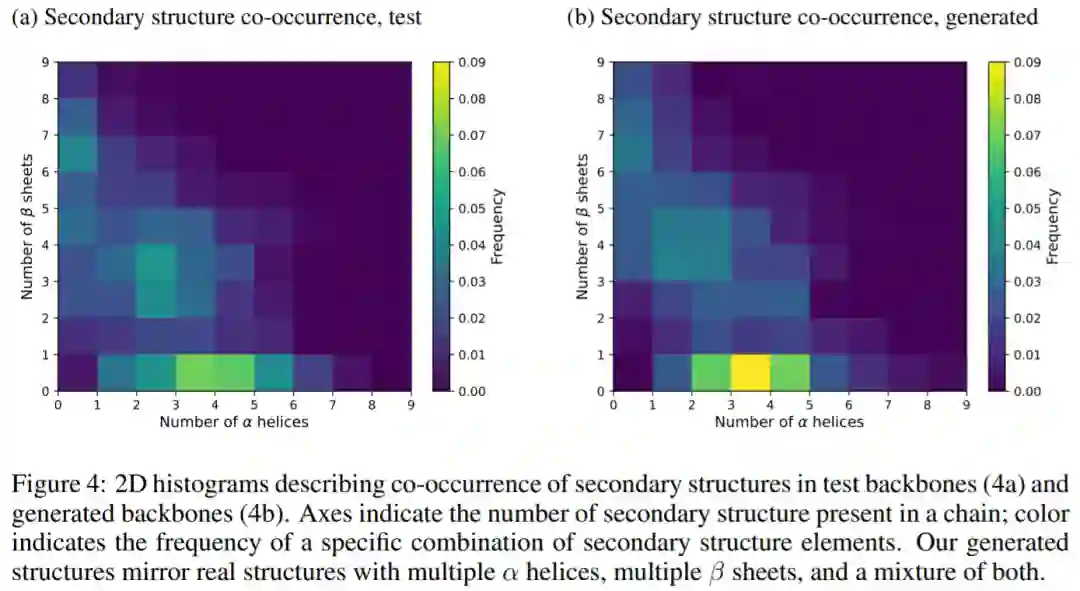 下图为在测试主链 (4a) 和生成主链 (4b) 中出现二级结构的二维直方图,结果表明生成的结构反映了蛋白质真实的结构,有多个α螺旋,多个β sheets ,以及两者的混合。