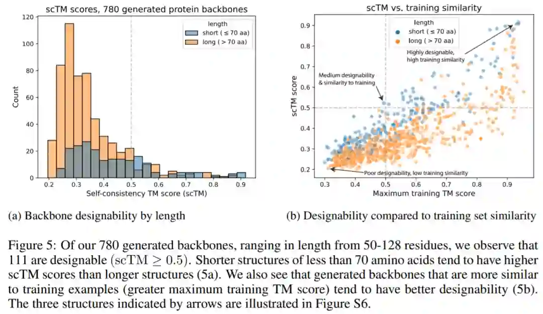 下图表明,在生成的 780 个结构中有 111 个(占比为 14.2%)是可设计的,其 scTM 评分≥0.5(图 5a),高于 Trippe 等人报告的 11.8% 的值。我们还看到,生成的主链与训练示例更相似,往往具有更好的可设计性(5b)。