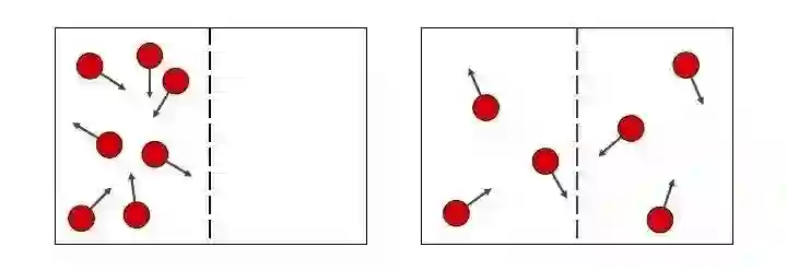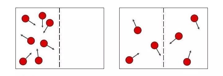 举个例子:假设空间内存在 6 个气体分子(图一),一开始所有的气体分子都被挡板压缩在容器的左半边。现在将挡板撤出,分子会自行扩散,充满整个容器(图二)。