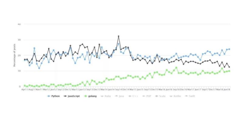 近日,Hacker News 发布了 2018 年 7 月的编程语言招聘趋势排行榜,其中,Go 语言已经反超 Java 进入了前三名的行列。从浅绿色的 Go 语言走势图可以看出来,企业对于 Go 语言的采用情况在逐年上升。