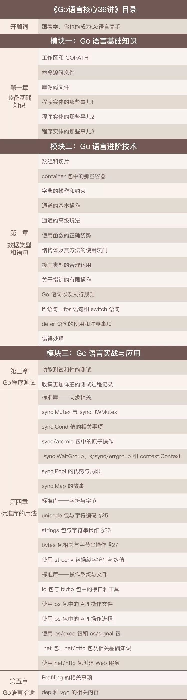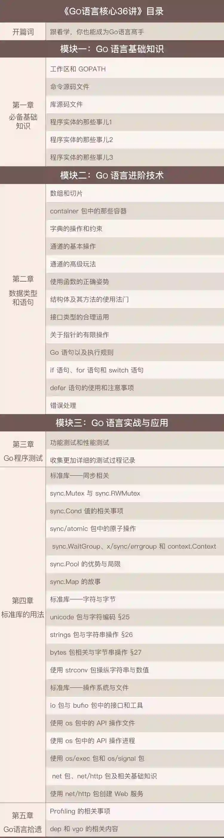 在这个专栏中,我会为你梳理出知识脉络,把 Go 语言的精华共分成 5 大模块,共 36 篇 精拆细说。