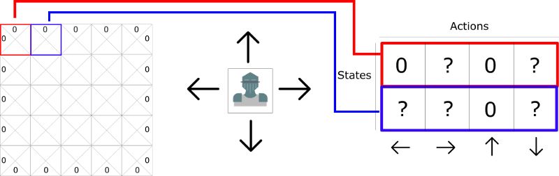 我们构建一个Q表,有 m 列 (m = 行动数)和 n 行(n =状态数)。我们将值初始化为0。