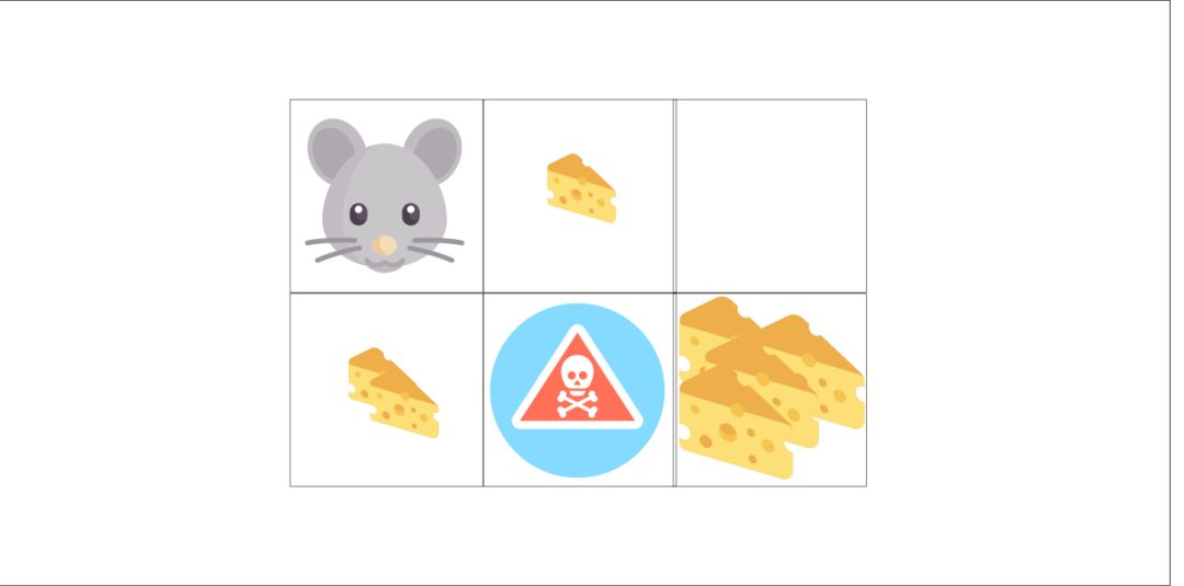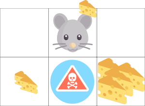 发现了一块奶酪(+1),则更新的Q值并记录向右的行动。通过Bellman方程来进行计算。