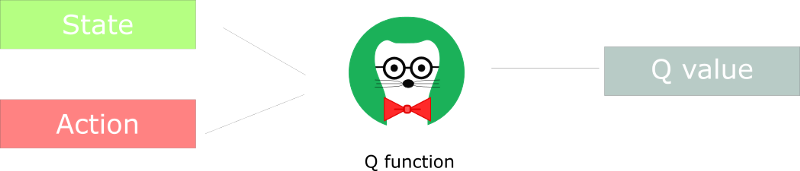我们可以把这个 Q 函数作为一个阅读指南,通过滚动 Q 表找到与我们的状态相关的行,以及与我们的动作相关联的列。它返回匹配的 Q 值。这个值就是“预期的未来奖励”。