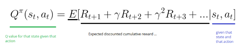 如果在 state 状态下给定的行动 action 是最佳策略,那么每个 Q 表评分为未来奖励的最大期望。