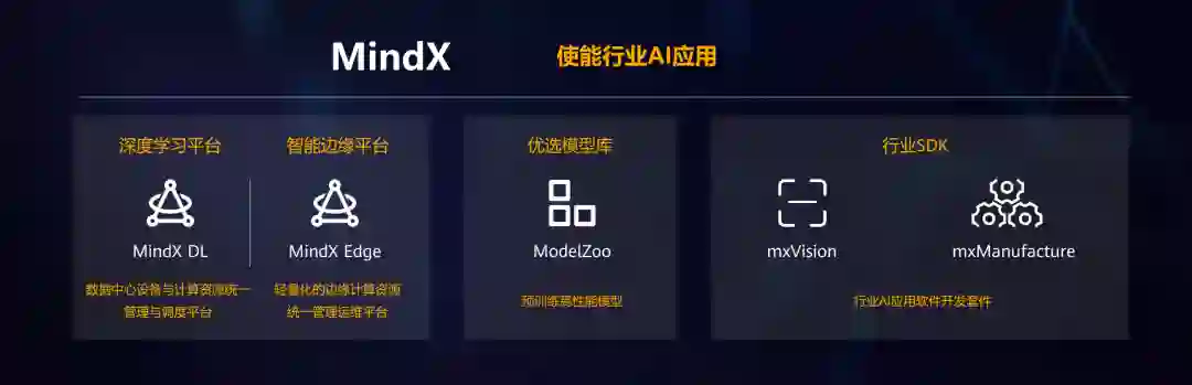 对于覆盖范围最大,不具备深度开发能力,但有开发 AI 应用需求的业务开发者,华为推出了应用使能工具 MindX,通过“2+1+X”助力 AI 计算融入千行百业。“2”是深度学习平台 MindX DL、智能边缘平台 MindX Edge、“1”是优选模型库 ModelZoo,“X”则是使能各行业 SDK。