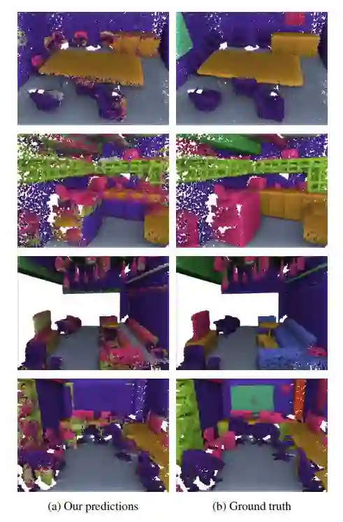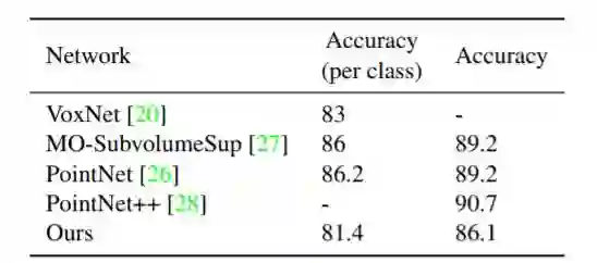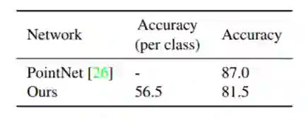 在语义分割方面,该方法在S3DIS上与PointNet比较。结果如下表所示,本文方法可达到与PointNet相差不大的结果。