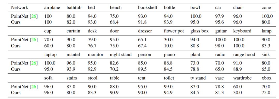 在目标识别方面,在ModelNet40和ObjectNN两个数据集上进行比较评估。本文提出的方法在结构极简的情况下仍能取得与PointNet与PointNet++基本相当的精度。ModelNet40上目标识别结果如下表所示。