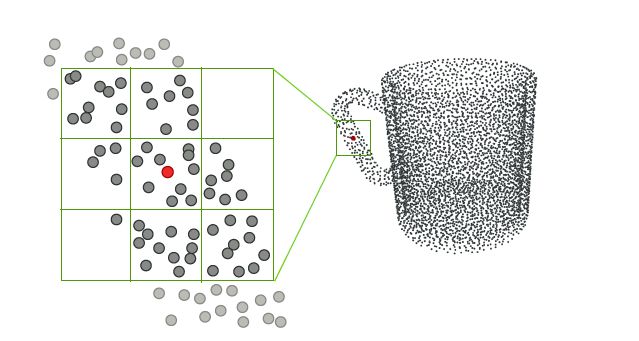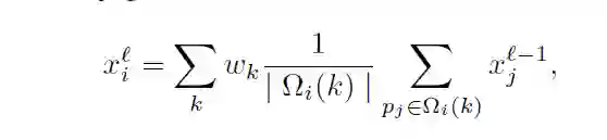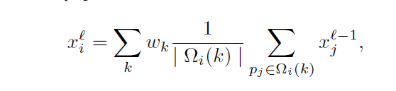 如图1所示,定义了一种新式点云卷积算子,对每个点,查找其近邻点并格网化进卷积核的子域中,然后按核权重进行卷积。卷积如下式所示。其中k在核所支持的所有子域上进行迭代,pi是第i个点的坐标,|·|代表子域内的点个数, wk是第k个子域的核权重,l-1和l是输入与输出层的序数。