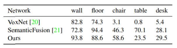 随后,再在SceneNN数据集上与VoxNet 以及SemanticFusion比较,如下表所示,可见本文提出方法更优。