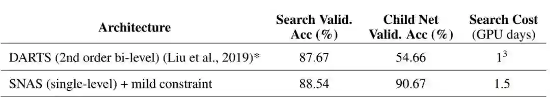 表 1:分别使用 SNAS 和 DARTS 得到的搜索验证准确率及子网络的验证准确率。标有「*」的结果是使用 Liu et al.(2019)的代码获得的。