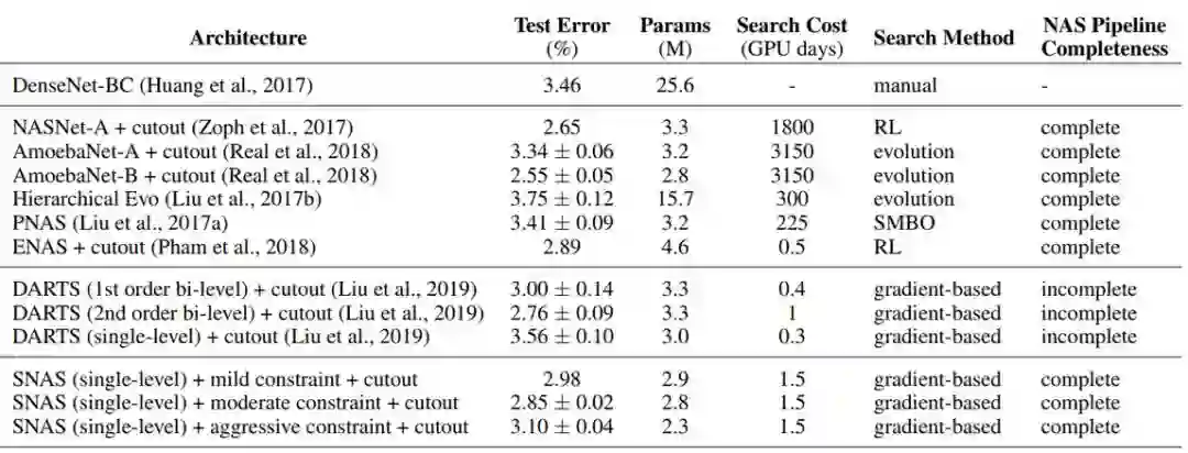 在本文的实验中,与 DARTS 和其它现有的 NAS 方法相比,SNAS 在测试误差、模型复杂度和搜索资源方面表现出了强大的性能。具体而言,在 CIFAR-10 数据集上进行测试时,SNAS 发现新的卷积神经架构可以在仅仅具有 2.8M 参数的情况下获得 2.85±0.02% 的测试误差,这比一阶 DARTS 搜索到的带有 3.3M 参数的网络所获得的 3.00±0.14% 测试误差和 ENAS 搜索到的带有 4.6M 参数的网络所获得的 2.89% 测试误差都要好。SNAS 搜索到的网络也在使用更少的参数的条件下,达到了与通过二阶 DARTS 搜索到的带有 3.3M 参数的网络(2.76±0.09%)相当的性能。通过更强的资源约束,SNAS 发现即使是更小的模型(带有 2.3M 参数)也能在 CIFAR-10 数据集上获得 3.10±0.04% 的测试误差。