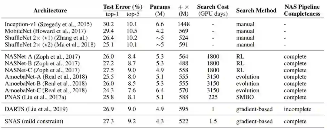 表 3:在 ImageNet 数据集上,SNAS 和最先进的图像分类的分类误差。