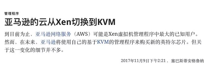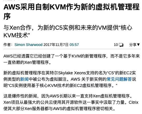 当然,在如今,两种虚拟化的边界也越来越模糊,选择适合自己的才是最重要的。而作为世界最大的云计算厂商AWS从诞生以来一直是XEN的拥护者,然后近几年也开始接入KVM,开始两者融合,为用户提供所需的服务。