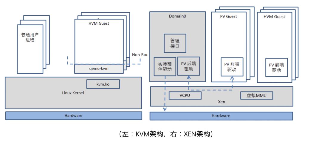 上图是KVM和XEN的架构对比图,首先,两者都属于硬件虚拟化(硬件提供结构支持帮助创建虚拟机监视并允许客户机操作系统独立运行)。