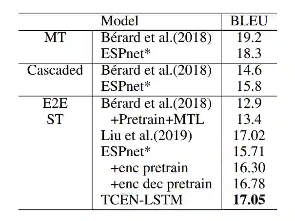 在该实验中,我们使用了基于 LSTM 的网络结构,没有利用额外数据进行 ASR 及 MT 模型的预训练。
