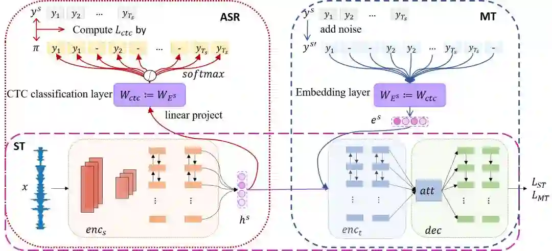 下文中,我们用 x=(x_1,x_2,…,x_(T_x )) 来表示输入的语音特征,y^s=(y_1^s,y_2^s,…,y_(T_s)^s) 表示源语言文本,y^t=(y_1^t,y_2^t,…,y_(T_t)^t) 表示目标语言文本。在训练中,共有三种可用数据集,ASR 数据集 A=(x,y^s ), MT 数据集 M=(y^s,y^t ) 和 ST 数据集 S=(x,y^t)。我们的目标是训练一个端到端模型,能够直接从 x 生成 y^t。