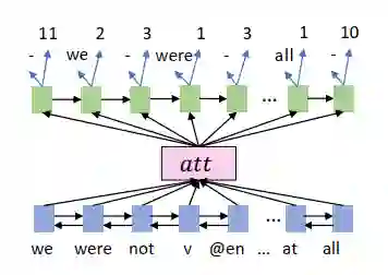 为了获得长度一致性,我们对机器翻译的数据进行了预处理,通过在源语言句子中添加重复和空符号,模拟 CTC 路径的格式。为了达到这个目的,我们训练了一个 seq2seq 模型,该模型同时预测出现的词以及重复的次数,如图2所示: