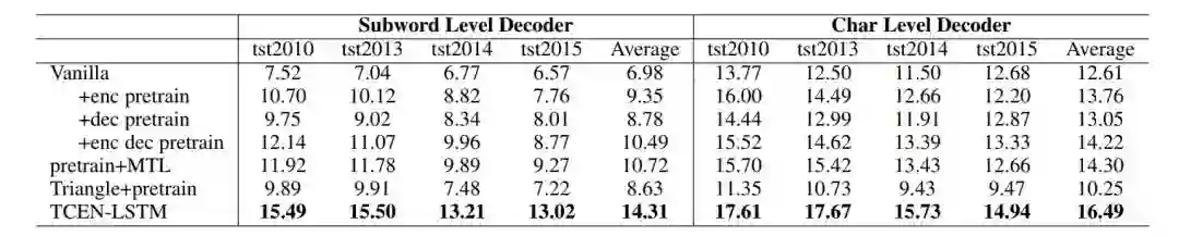 在本实验中,我们采用了 LSTM 的结构,并采用了 subword 和 character 两种解码方式进行实验。我们利用 TEDLIUM2 作为扩充 ASR 数据集,WMT18 En-De 和 WIT3 作为扩充 MT 数据集,实验结果如表2所示: