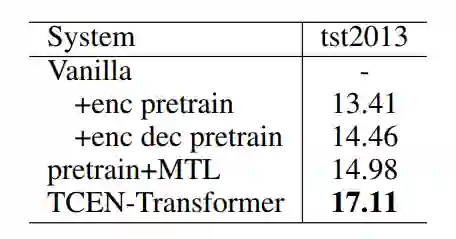 为了证明 TCEN 模型框架的适用性,我们进一步采用了 Transformer 的模型结构进行实验,在该实验中,我们仍使用 TEDLIUM2 作为扩充 ASR 数据集,仅使用 WIT3 作为 MT 数据集,并在 tst2013 上进行测试。实验结果如表3所示:
