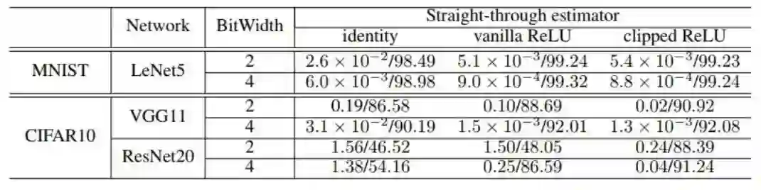 表 1:使用量化激活和浮点权重,三种不同的 STE 在 MNIST 和 CIFAR-10 数据集上的训练损失/验证准确度(%)。测试了 2 和 4 位的位宽。