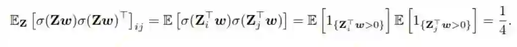 最后,对于元素为 E_Z[ σ(Zw) σ(Zw*)^T ]_{i, j} 的矩阵,如果 i≠j,则由于独立同分布的假设,该期望可以被分解和独立地评估。这会得到 E_Z[ σ(Zw) σ(Zw*)^T ]_{i, j} = E[ σ(Z_i^Tw) ] E[ σ(Z_j^Tw*) ] = 1/4.