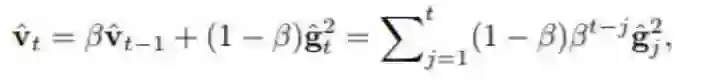 其中 g_t 是随机梯度,β 是 Adam 等深度网络优化器中可直接使用的一个超参数。移动平均线是通过之前在 t-1 的移动平均线、在时间 t 的当前梯度的平方与决定每个分量所受重视程度的参数 β 的凸组合(convex combination)而计算得到的。