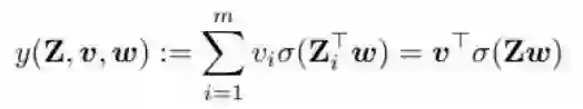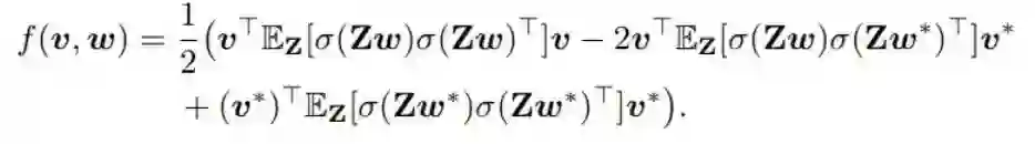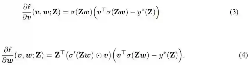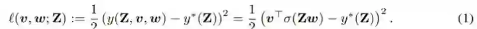 其中 Z ∈ R^(mxn) 是输入,w ∈ R^n 和 v ∈ R^n 分别是第一和二层线性层的权重。(Z_i)^T 表示 Z 的第 i 行,σ( ⋅ ) 是在向量 Zw 上逐分量工作的激活函数。第一层用作卷积层,第二线性层用作分类器。标签根据 y*(Z) = (v*)^T σ(Zw*) 生成,其中 v* 和 w* 是一些最优参数。式 (1) 描述了损失函数,其就是一个简单的平方损失: