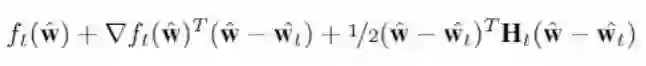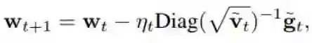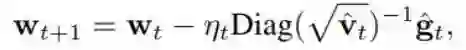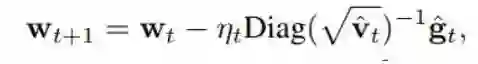 其中优化是针对 ^w 而言,Ht 是指在 ^w 的 Hessian。某些读者可能了解这个,而且知道这是 ft(^w) 的二阶泰勒展开。在实践中,Hessian 往往具有高昂的计算成本,所以往往使用近似的 Hessian。这里也是如此,这里的 Hessian 近似为了 Diag( √^v_t),其中 ^v_t 是移动平均线(moving average)。