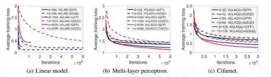 图 2 的 (b) 和 (c) 分别给出了多层感知器和 Cifarnet 的结果。类似于简单线性模型,参数 d 越大,与使用全精度梯度相比,量化梯度的收敛劣化就越严重。
