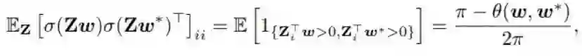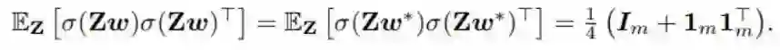 也就是说,E_Z[ σ(Zw) σ(Zw)^T ] 沿对角的元素等于 1/2,其它地方为 1/4。E_Z[ σ(Zw*) σ(Zw*)^T ] 也有一样的参数。