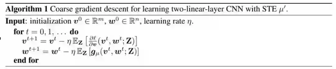 这篇论文主要关注的是算法 1 中总结的粗粒梯度下降的行为。其研究了 STE 被设置为基本 ReLU、截断式 ReLU(clipped ReLU)和恒等函数的导数的情况。这篇论文证明通过使用普通或截断式 ReLU 的导数,算法 1 会收敛到一个临界点;而使用恒等函数则不会。