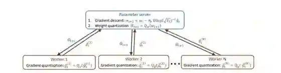 然后使用损失感知型权重量化计算量化的权重,得到 (^w_(t+1)) = Q_w(w_(t+1)),然后在下一轮迭代将其发送回工作器。