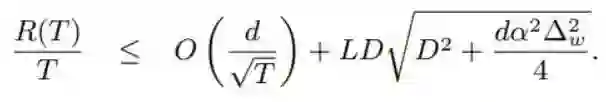 第二项很直观,维度和分辨率 ∆_w 越高,平均后悔值的边界就宽松。此外,常数 L 和 D 直观地描述了 ∇f_t 和 w 的最糟情况的「拉伸/变化」行为,它们也能宽松化平均后悔值的边界。