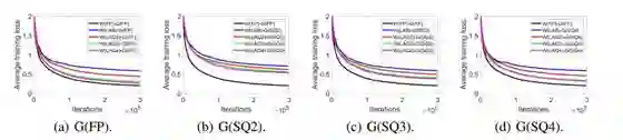 图 3 展示了不同位数的量化权重下平均训练损失的收敛情况。结果表明,使用全精度或量化的梯度时,权重量化网络在收敛后的训练损失比全精度网络更高。使用的位数越多,最终损失就越小。这确认了分析部分的结果,也是我们直观上能预期的结果。