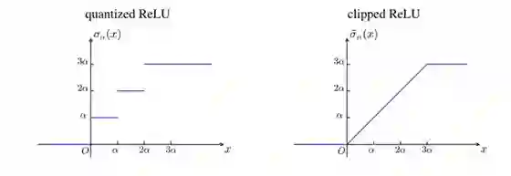 图 2:一个四级(2 位)量化的截断式 ReLU σ_α(x) 和对应的非量化版本。α 是量化级别。