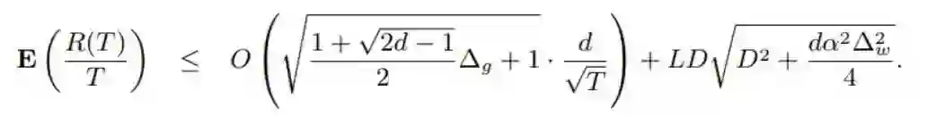 其中 R(T) 是后悔值。这里,平均后悔值的收敛速度为 d/√(T),其中 d 是维度。还有一个与权重量化分辨率 ∆_w(量化层级之间的步长)和维度相关的非零项。L 是 ft 的梯度的 Lipschitz 常数,D 也是一个常数,其为所有 w\m, wn ∈ S(S 是量化权重值的集合)限定了 || w*\m - w_n* || 的边界。