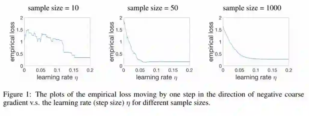 作者在论文中给出一个说明,其表示粗粒梯度下降的收敛保证基于训练样本无限的假设。在仅有少量数据时,在粗粒尺度上,实验损失大致会沿负粗粒梯度方向下降。随着样本规模增大,实验损失会变得单调和平滑。图 1 给出这一思路的图示。