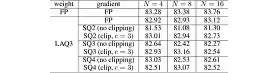 表 1 还包含了使用梯度裁剪(gradient clipping)的结果。梯度裁剪是一种防止非常深度的网络中梯度爆炸问题的技术。梯度爆炸是指梯度变得过大且错误梯度累积的情况,这会导致网络不稳定。尽管如此,我相信从表 1 可以看到量化模型能够实现与全精度模型相媲美的表现。