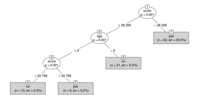 # Include required packages library(party) library(partykit) # Have a look at the first ten observations of the dataset print(head(readingSkills)) input.dat <- readingSkills[c(1:105),] # Grow the decision tree output.tree <- ctree( nativeSpeaker ~ age + shoeSize + score, data = input.dat) # Plot the results plot(as.simpleparty(output.tree))
