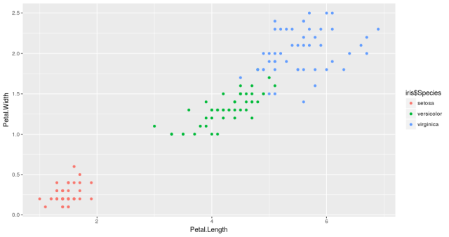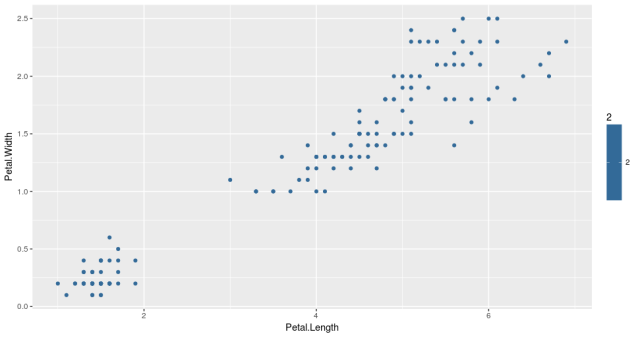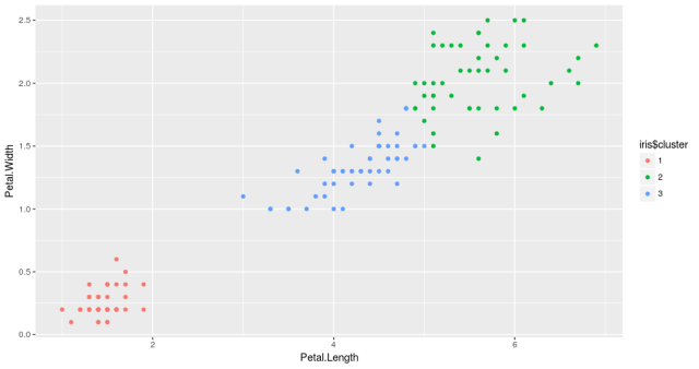 # Load required packages library(ggplot2) library(datasets) # Load data data(iris) # Set seed to make results reproducible set.seed(20) # Implement k-means with 3 clusters iris_cl <- kmeans(iris[, 3:4], 3, nstart = 20) iris_cl$cluster <- as.factor(iris_cl$cluster) # Plot points colored by predicted cluster ggplot(iris, aes(Petal.Length, Petal.Width, color = iris_cl$cluster)) + geom_point()