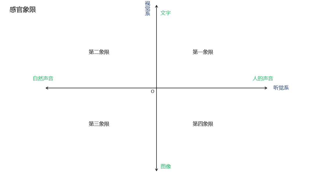 那么,我们以听觉系为X轴、视觉系为Y轴,建议二维直角坐标系。听觉系的两端为人的声音(以语言为主)、自然声音;视觉系的两端则是文字和图像。