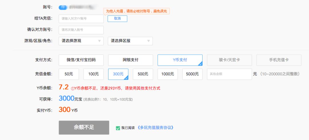 凤凰网科技《风眼》栏目注意到,YY平台上提供多种代充服务,包括YY游戏中心的页游端游充值,支持用户通过代充的方式获得Y币,代充方需要网上支付钱款,也可以通过代充方式获得游戏元宝或点卡,代充方可以用钱也可以用Y币来支付;在YY直播也提供Y币的代充服务,只需要对方的账号即可帮助对方充值Y币。