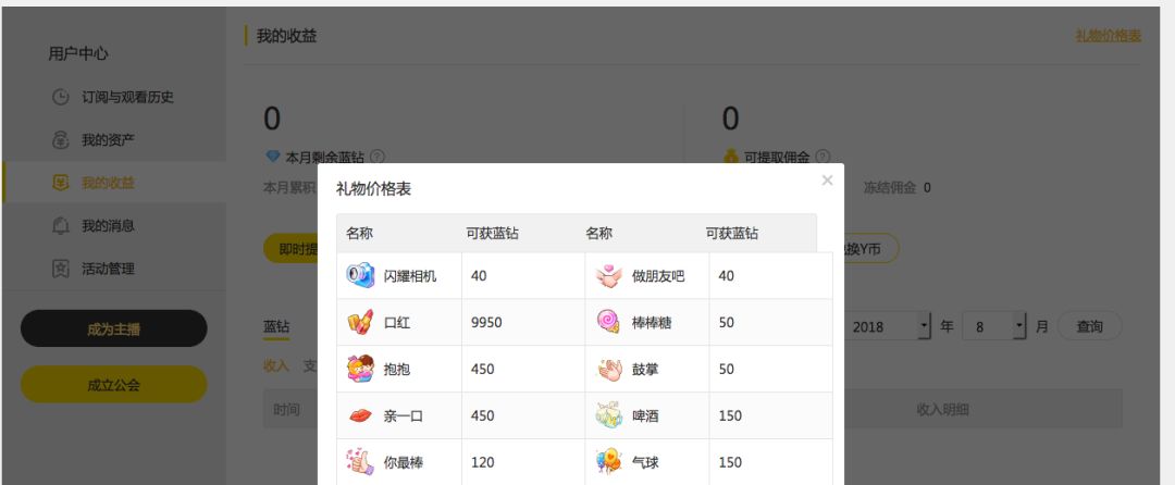 在YY直播上,主播获得礼物打赏,可以根据价格表折合成数量不等的蓝钻,比如1个闪耀相机可以获得40个蓝钻,一支口红可以获得9950个蓝钻,这些蓝钻相当于主播获得的“货币”,主播可以进行即时提现。蓝钻也可结算为佣金,平台根据主播身份、佣金兑换比例等因素,将剩余蓝钻按一定比例结算佣金。