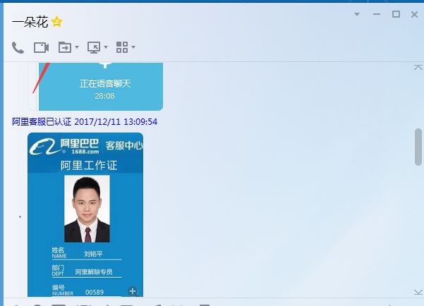 随后,就有一个账号名为“在线10001”阿里旺旺账号联系李先生,对话截图中显示其工号为0325,说可以帮李先生解除账户冻结,并提供1806162279的QQ号,告诉李先生“这是阿里的工作人员,会帮忙解决的。”