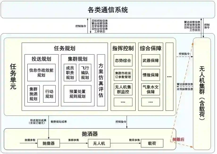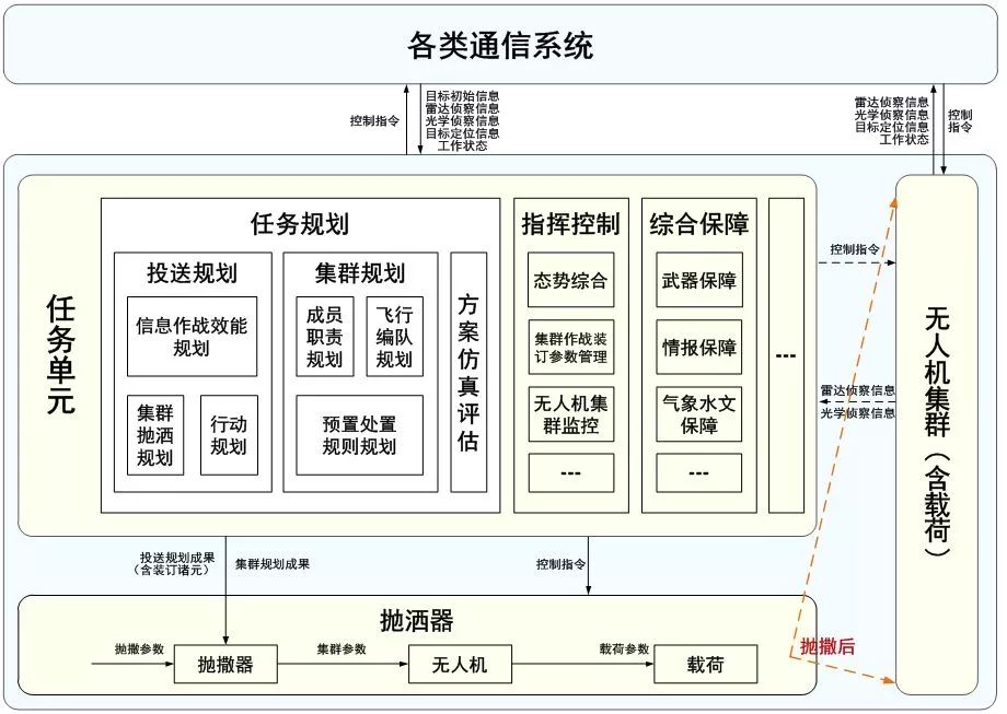 实施阶段,接受打击命令后,指挥员根据打击目标信息进行方案筛选、匹配和调整,形成作战计划,并生成抛撒器装订诸元和集群作战装订参数,并进行参数装订;按照计划时间,抛撒器将无人机集群远程投送之指定空域,按照抛撒计划抛撒无人机集群;无人机集群根据预先设定的飞行编队计划进行协同侦察和干扰,回传精确目标指示信息或高价值情报信息。